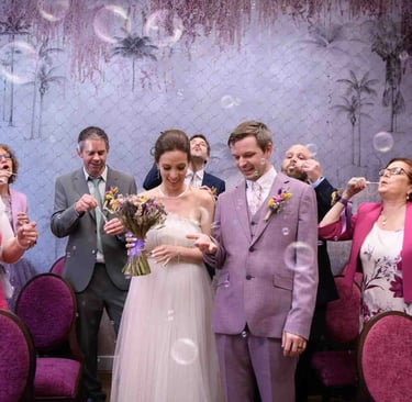 After the ceremony, we stayed inside and captured portraits on the famous indoor bridge at Lambeth Town Hall. Bubbles floated through the air, adding a playful and magical touch to the photos. Meanwhile, Ben and Patricia laughed, hugged, and enjoyed the moment, creating joyful, candid shots that perfectly captured the fun and love of the day.
