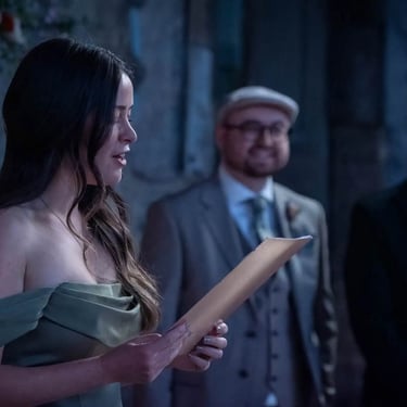 Their ceremony inside the chapel felt cinematic without trying to be. Light filtered softly through the stained glass while guests leaned in, laughed and wiped away the odd tear.